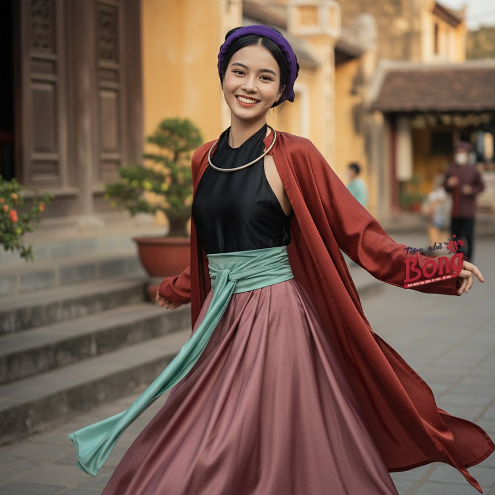 Set Tứ Thân Đen Hồng Khoác Nâu (Kèm Khăn Vấn Tóc) mang đậm dấu ấn trang phục cổ truyền Bắc Bộ. Áo tứ thân với tông đen nền nã kết hợp hồng tươi trẻ tạo sự cân bằng giữa nét trang nghiêm và duyên dáng. Phối cùng áo khoác nâu trầmkhăn vấn tóc, tổng thể trang phục trở nên hài hòa, thanh lịch và đúng chất truyền thống.