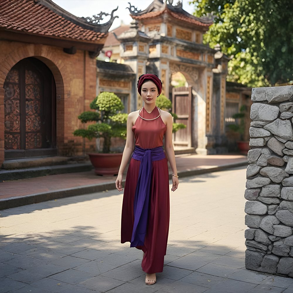Set Tứ Thân Nâu Đỏ Khoác Trắng (Kèm Khăn Vấn Tóc) là trang phục truyền thống mang đậm bản sắc văn hóa Việt. Áo yếm nâu nền nã kết hợp với váy đỏ tạo nên sự đối lập hài hòa, vừa kín đáo vừa nổi bật. Áo khoác tứ thân màu trắng phủ ngoài gợi hình ảnh người phụ nữ thôn quê xưa, mộc mạc mà duyên dáng. Khăn vấn tóc đi kèm hoàn thiện tổng thể, thích hợp cho các dịp lễ hội dân gian, trình diễn cổ phục hay chụp ảnh nghệ thuật.