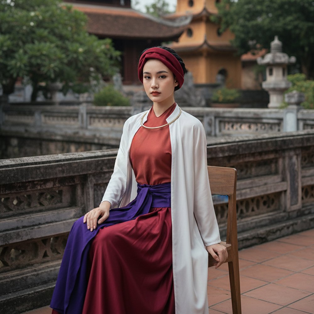 Set Tứ Thân Nâu Đỏ Khoác Trắng (Kèm Khăn Vấn Tóc) là lựa chọn lý tưởng cho những ai yêu thích trang phục truyền thống Bắc Bộ. Với gam màu nâu đỏ ấm áp kết hợp áo khoác trắng thanh khiết, bộ trang phục mang lại sự cân bằng giữa nét cổ điển và vẻ tinh tế hiện đại.