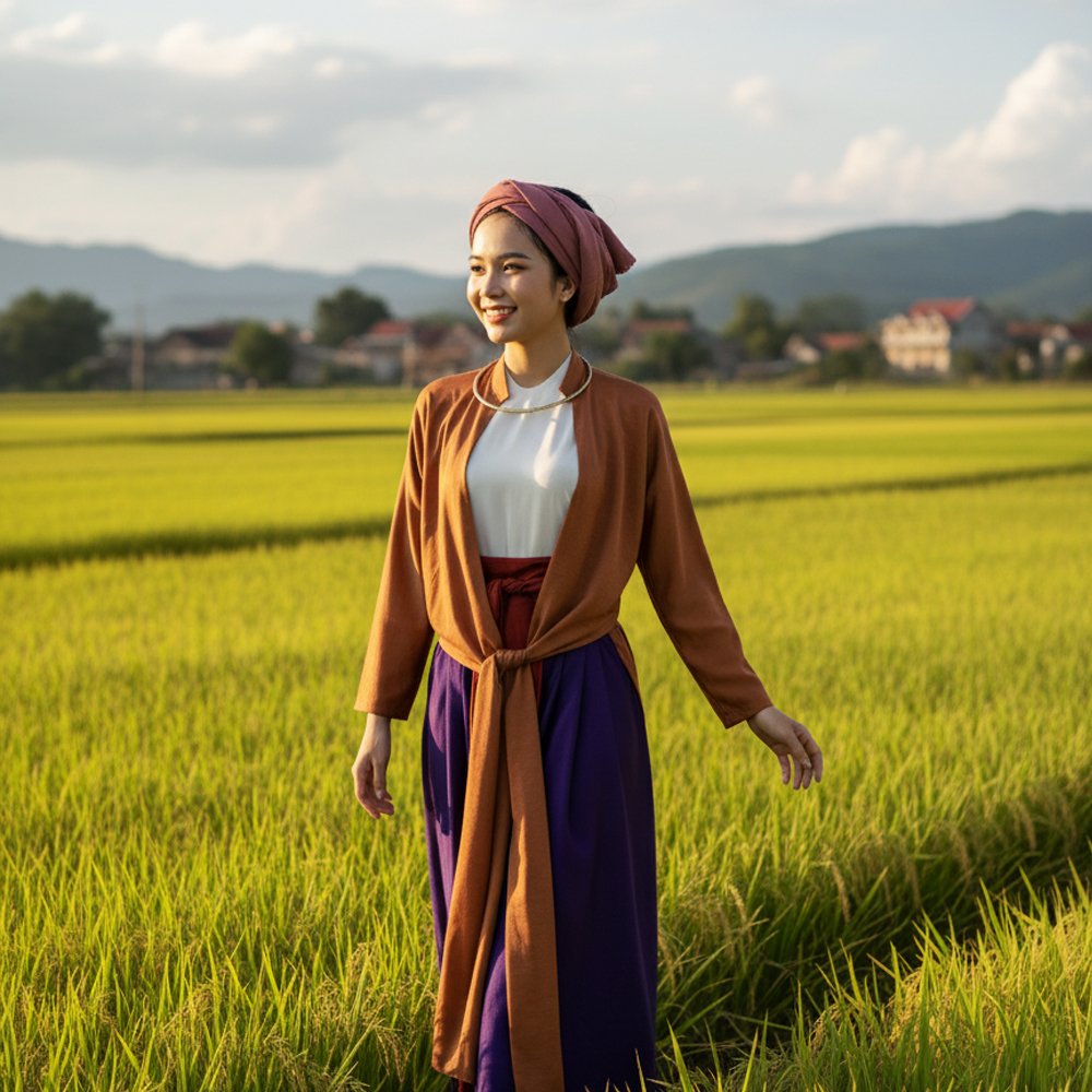 Set Tứ Thân Trắng Tím Khoác Nâu (Kèm Khăn Vấn Tóc) là trang phục truyền thống mang đậm bản sắc văn hóa Việt. Áo yếm trắng nền nã kết hợp với váy tím tạo nên sự đối lập hài hòa, vừa kín đáo vừa nổi bật. Áo khoác tứ thân màu nâu phủ ngoài gợi hình ảnh người phụ nữ thôn quê xưa, mộc mạc mà duyên dáng. Khăn vấn tóc đi kèm hoàn thiện tổng thể, thích hợp cho các dịp lễ hội dân gian, trình diễn cổ phục hay chụp ảnh nghệ thuật.