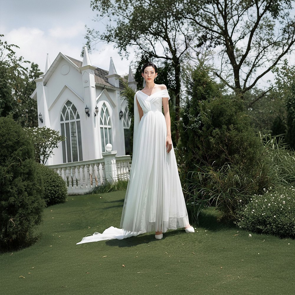 Váy Dài Trễ Nửa Vai Lưới THE NELLA Trắng là một thiết kế tinh tế của nhà THE NELLA dành cho cô dâu. Với phần vai trễ nửa, chiếc váy giúp tôn lên bờ vai và xương quai xanh quyến rũ. Chất liệu lưới mềm mại tạo nên vẻ đẹp nhẹ nhàng, bay bổng. Màu trắng tinh khôi của váy mang lại sự thanh lịch và thuần khiết cho ngày trọng đại.