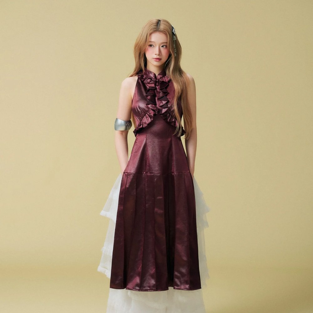 Thiết kế yếm ôm nhẹ giúp tôn phần thân trên, kết hợp chân váy rũ mềm tạo nên tổng thể trang phục cân đối, nữ tính và thanh lịch. Mẫu yếm này đặc biệt phù hợp với những concept cần sự duyên dáng, nhẹ nhàng nhưng vẫn có điểm nhấn thị giác rõ ràng.