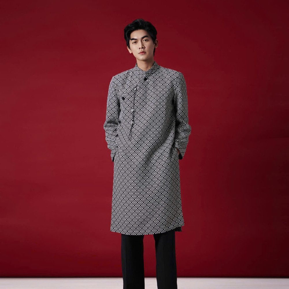 Thuê Áo Dài Nam Lasol Hoa Văn Đen Trắng – Thanh Lịch & Đẳng Cấp tại Tiệm Nhà Bông