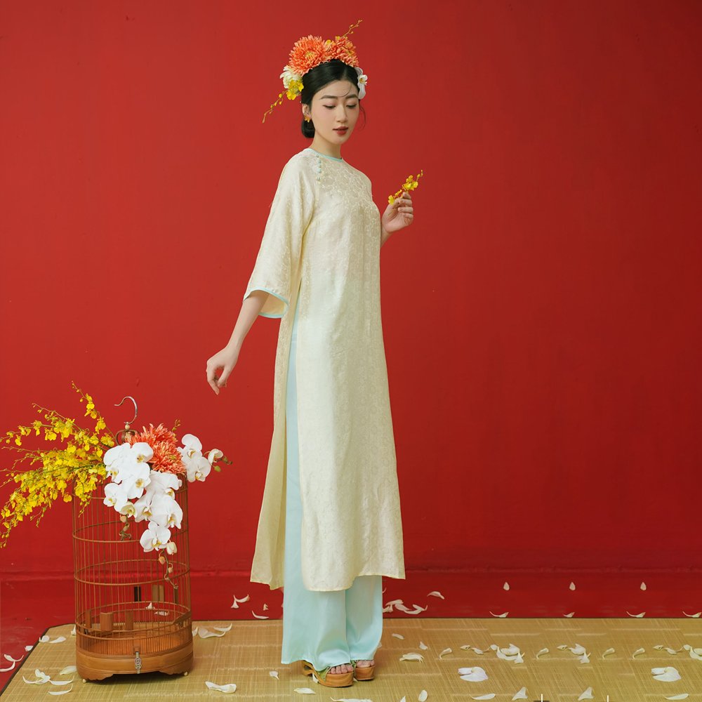 👉 Với áo dài vàng kem cổ tròn hoa chìm, bạn sẽ thật rạng rỡ và tự tin trong mọi khoảnh khắc đáng nhớ.