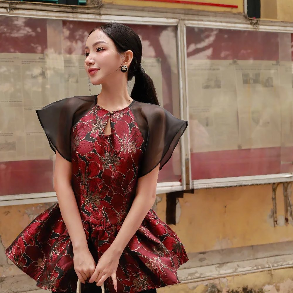 Thiết kế yếm phối đỏ – đen đối lập tạo nên điểm nhấn ấn tượng, cùng họa tiết hoa gấm tinh xảo làm tôn lên vẻ đẹp quý phái, kiêu sa của người mặc. Bộ trang phục vừa gợi nét cổ điển, vừa toát lên sự duyên dáng hiện đại.